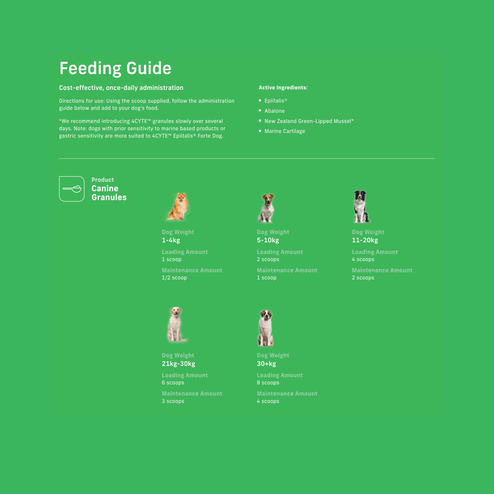 4CYTE™ granules can be easily added to your dog’s favourite meal, bringing you a simple and convenient way to support their joint health. The granules can also be used as a preventative measure to actively maintain healthy joints in dogs from as young as 6 months of age, offering you peace of mind that you are providing your dogs with the utmost care, and safeguarding their joints in the long run.