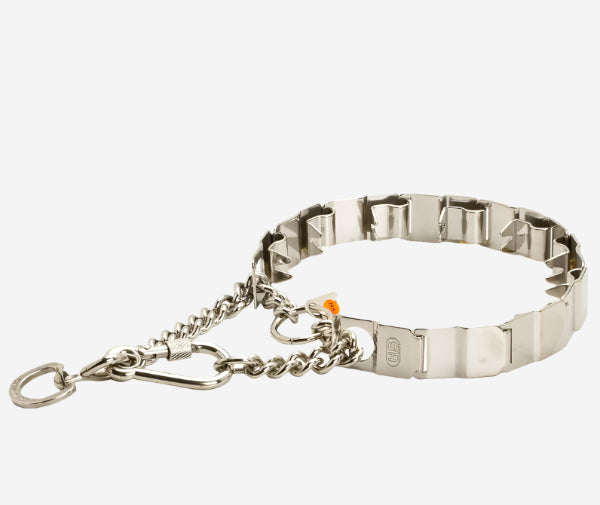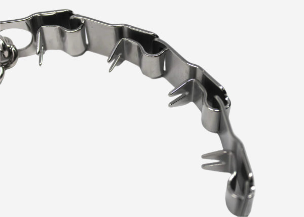 - Interlocking links, each equipped with two blunt, slightly bevelled prongs, provide firm yet gentle control.